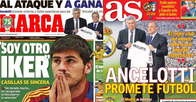 The two main Madrid sports newspapers highlight in their front pages the words of Carlo Ancelotti during his unveiling as new Real Madrid manager.