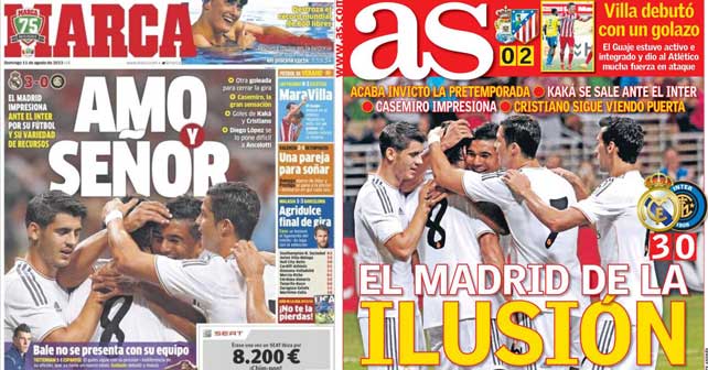 Both Madrid papers put their focus on Real Madrid’s victory over Inter Milan. “The Madrid of illusion”, titles As. “Los Blancos end the pre-season unbeaten. Kaka and Casemiro make a big impression”, they add.