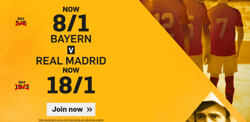 You can bet on this game with the enhanced odds Betfair are offering to their new customers. Back Bayern Munich with 7/1 odds or Real Madrid with 18/1 odds.