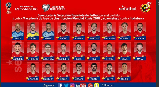 On Friday morning, the Spanish national coach, Julen Lopetegui, made public the list. Spain will face Macedonia on Saturday the 12th of November, in a qualifying game for the Russian World Cup, and England at Wembley Stadium on Tuesday the 15th of November, in a friendly game.