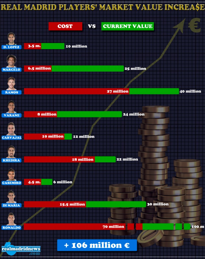 Here are the members of the current squad whose current value -according to TransferMarkt.com– is higher than the price Real Madrid paid for them. The total potential profit on these players would be 106 million euros: