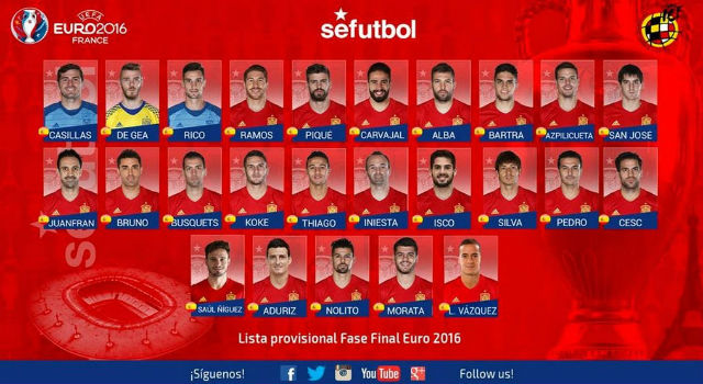 Vicente del Bosque has called the 25 players that will be eligible to play the Euro 2016. The Spanish coach has still to ruled out two players before Spain’s first game against Czech Republic.
