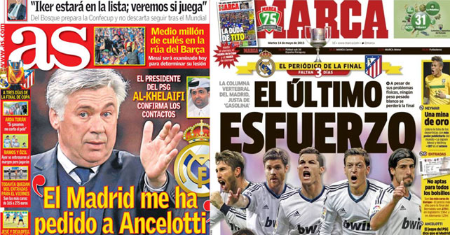 Both Madrid daily papers also highlight the interview of Paris Saint Germain president, Nasser Al-Kheilafi, with L’Equipe, in which he admitted Real Madrid have tried to sign Carlo Ancelotti for the next season.