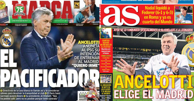 “Ancelotti tells PSG of his intention to coach Real Madrid”, says Marca, whose main headline is “The Peace-Maker”. “Real Madrid directors have given him that nickname because they think he is the right person to bring peace back to the club”, they claim.