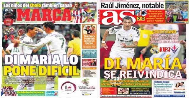 The main story in Marca and AS today is the performance of Angel di Maria in Real Madrid’s loss to Fiorentina 2-1 in Warsaw.
