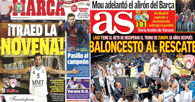 With little to celebrate for Madrid in terms of football, both Marca and AS opt for the Real Madrid’s final against Olympiacos in basketball’s European Cup as their front pages.