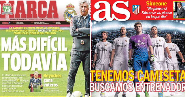 Spanish sports paper Marca claims in its front page that Carlo Ancelotti’s signing for Real Madrid has turned even more complicated after Paris Saint Germain sports director Leonardo Nascimento has been penalized with a nine month ban for having pushed a referee in a League 1 game against Valenciennes.