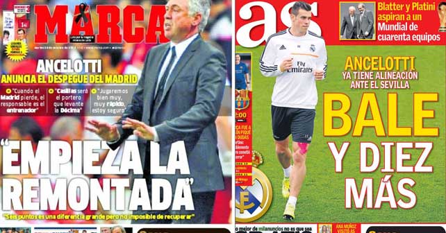 Meanwhile, As main headline today is “Gareth Bale and ten more.” The Madrid daily states “Ancelotti has already decided the line-up for Sevilla game” and the Welshman will be one of the starters. Los Blancos will face the Andalucians on Wednesday at Santiago Bernabeu in their next La Liga match.