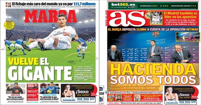 AS, meanwhile, is particularly enjoying the ongoing crisis at Barcelona and opts for that story as the main one on its front page. Yesterday, the Catalan club was ordered to pay 11.2 million euros to that Spanish tax authorities over the Neymar transfer, but they maintain no wrongdoing happened.