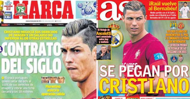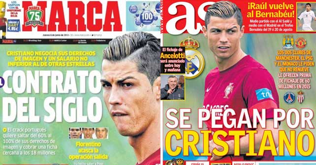 The two main Madrid sports newspapers put their focus in the negotiations between Real Madrid and Cristiano Ronaldo for the renewal of the Portuguese’s contract with Los Blancos.