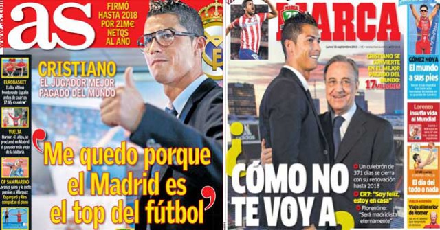 Madrid sports newspaper As claims this morning in its front page that Cristiano Ronaldo has become the world’s best paid football player after signing his contract renewal with Real Madrid.