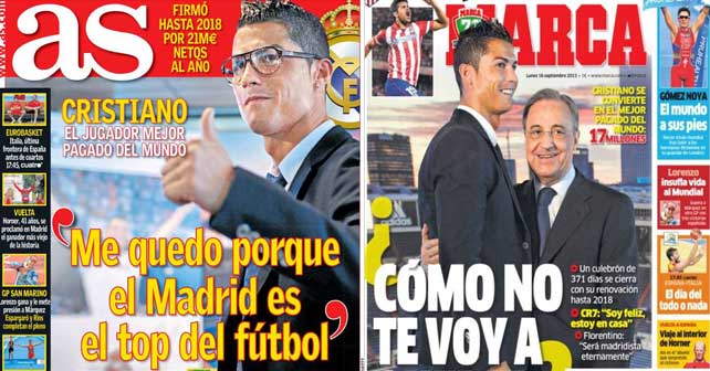 “He has signed until 2018 for 21 million euros a year”, they state. As main headline is a sentence by Cristiano Ronaldo: “I’m staying because Real Madrid is the top of football”.
