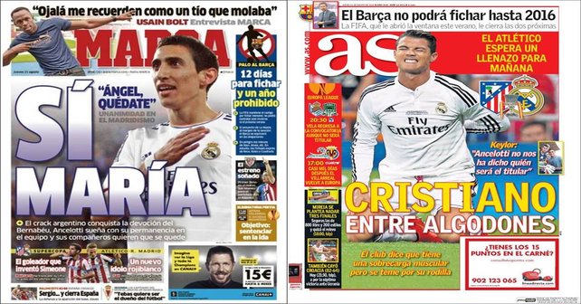 Finally, Marca goes with a picture of di Maria on its front page, and says the Argentina winger has convinced club coaches and directors that he should stay. The players want him to remain a Los Blancos player and the winger himself is keen on staying at the Santiago Bernabeu.