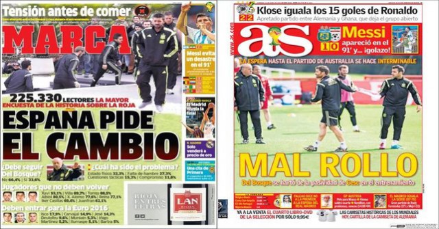 The inquisition into the Spanish World Cup debacle continues this monrning, with both Marca and AS highlighting the rifts between players in the squad as a major issue. Marca has also carried out a poll in which the majority of readers wants change. Two thirds of the readers think del Bosque should no longer the boss, while they call for a number of changes in the playing squad too.