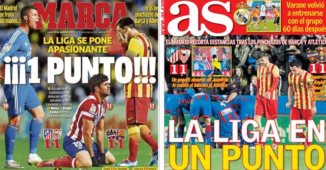 “One point!” titles Marca on its front page. “The fight for La Liga gets exciting as Barcelona and Atletico drop points against Levante and Sevilla,” they point out.