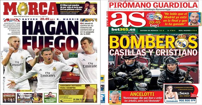 The Madrid press have gone to town on the theme around fire, after Karl Heinz Rumminegge said last week that even the trees in Munich would be burning upon Madrid’s arrival in town. AS goes with ‘Firemen’ on its front page, with mocked up image of Iker Casillas and Cristiano Ronaldo putting out a fire.