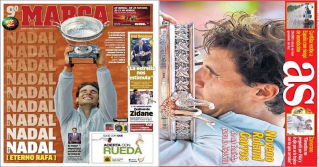 Real Madrid fan Rafael Nadal dominates the sports pages today after winning his ninth French Open yesterday evening, and his 14th Grand Slam in total, bringing him level with the great Pete Sampras.