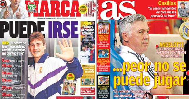 Marca highlights today in their front page yesterday’s words by Iker Casillas. “If in three months this situation hasn’t changed, I might tell you that I’m considering leaving,” the goalkeeper said.