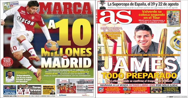 But the main talking point this morning is the signing of James Rodriguez. Both Marca and AS go with the Colombian on their front pages and say the deal is almost done. According to Marca, Los Blancos have offered 75 million euros for the attacking midfielder, while Monaco are looking for 85 million. The paper says once the final figure is agreed, the transfer will be confirmed.