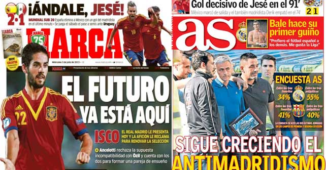 Both Madrid sport dailies highlight in their front pages Real Madrid’s youngster Jese Rodriguez brilliant performance against Mexico at the Under-20 World Cup.