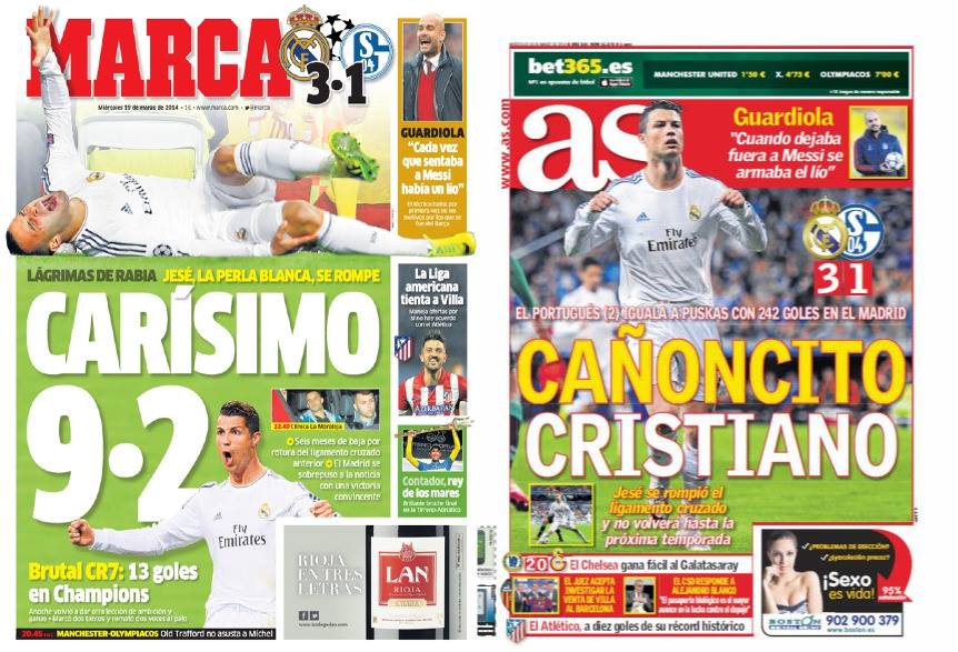 In more positive news, Marca and AS both mention the fact Ronaldo’s two goals last night mean he not only warmed up for the Clasico in the best possible way, but also drew level with Ferenc Puskas on the list of top goalscorers in the history of Real Madrid. His 13 goals in the Champions League this season so far also means he is just one goal short of equaling the record for the most number of goals scored in one campaign.