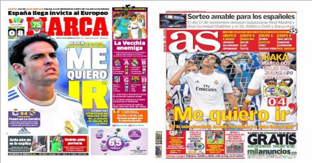 The front pages of the two sports papers in Madrid – Marca and AS – are dominated by Real Madrid’s Brazilian playmaker Kaka, who says he wants to leave the club before the end of the transfer window.