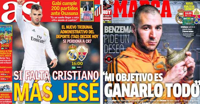 Elsewhere, AS goes with a picture of Jese on the front page, and says when Ronaldo is missing, Los Blancos have a ready-made replacement. In ludicrous circumstances, the Tribunal Administrativo del Deporte (TAD) will decide this morning whether Ronaldo’s appeal over his ban can be overturned. If it is, he will be available for today’s match.