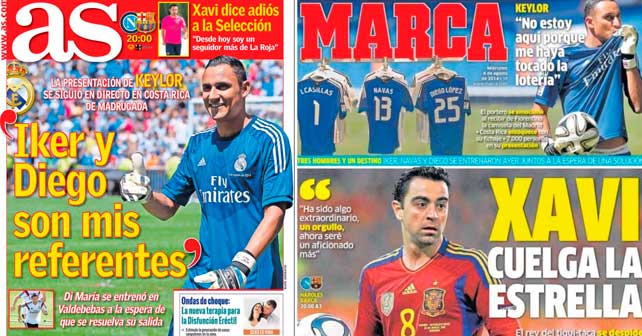 Meanwhile, the other main Madrid sports paper, As, brings to its front page Navas statement on Casillas and Lopez: “Iker and Diego are my models,” he confessed.