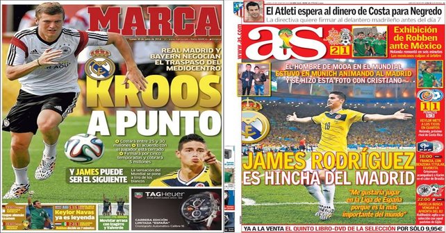 In terms of Real Madrid news, transfers once again dominate the pages in the two main sports papers, Marca and AS. The former leads with Toni Kroos while the latter goes with Jame Rodriguez.
