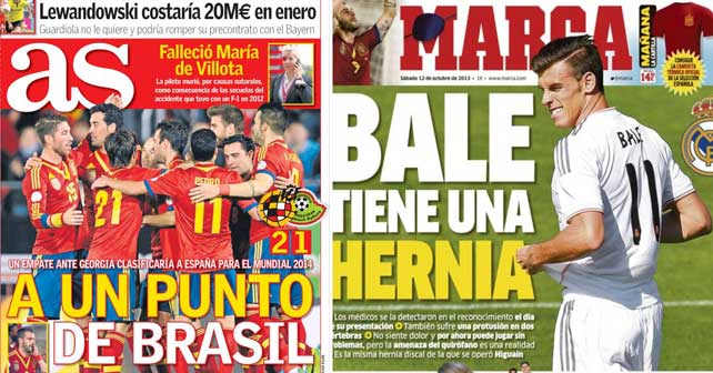 Both Madrid sports dailies highlight Spanish national team 2-1 victory against Belarus, which leaves them one point away from sealing their place in the 2014 World Cup. Iker Casillas didn’t finally make it in the starting eleven, leaving his sport to Victor Valdes. Real Madrid defenders Sergio Ramos and Alvaro Arbeloa did play the 90 minutes.