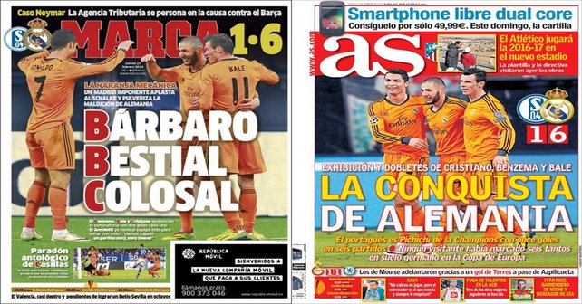 Unsurprisingly, the Madrid press has plenty of coverage of the match, and there is much focus in the BBC trio of Bale, Benzema and Cristiano, who all scored two goals each. Barbaric, Bestial, Colosal, screams Marca’s front page.