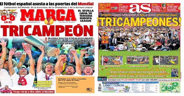 The front pages of the sports papers in Spain are dominated by Sevilla’s success in the Europea League final last night, defeating Benfica 4-2 on penalties to win the competition for the third time in the last nine years.