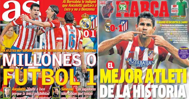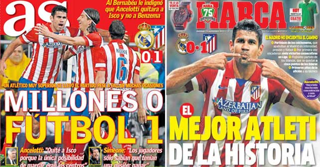 Madrid sports newspapers praise today Atletico Madrid’s brilliant match against Real Madrid in the derby. Los Blancos lost 0-1 to their city rivals with an early Diego Costa’s goal.