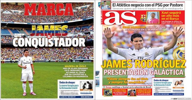 Marca and AS both go with the Colombian on their front pages with his quote “It’s a dream come true” as the main headlines. The two papers dissect the events from the speeches by the player himself, Florentino Perez and the Colombian ambassador, to the sheer number of fans in the stadium to greet James.