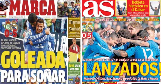 Madrid sports newspapers emphasize in their front pages Real Madrid’s emphatic 0-5 victory over Betis in a great game by Los Blancos.