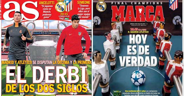 Madrid sports newspapers agree today in their front-pages that Real Madrid and Atletico Madrid will play the most important derby in the history, as they meet in Lisbon tonight in the Champions League final.