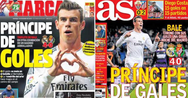 Both Madrid sports newspapers demonstrate their ‘originality’ in their front pages, highlighting Gareth Bale’s perfect hat-trick in Real Madrid’s 4-0 win over Valladolid.