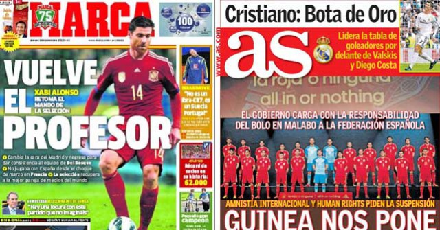 Marca’s main headline today is “The professor is back,” in a reference to Xabi Alonso -who had probably never been called a professor before- returning to Spanish national team to play two friendlies against Equatorial Guinea and South Africa.