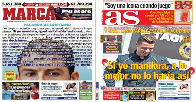 And the main story in the Madrid papers this morning – with Marca and AS both going for the issue on their front pages – is Cristiano Ronaldo speaking out about Los Blancos’ transfer activity. The Portuguese forward, taking a three week break altogether to recover from various injury niggles, said if he were in charge of the club he would have done things differently, particularly over the decision to sell Xabi Alonso and di Maria.