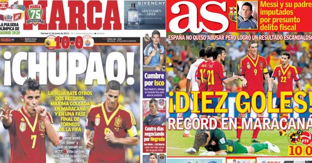 Both Madrid dailies put their main focus on Spain’s 10-0 win over Tahiti in the Confederations Cup. Real Madrid defender’s Sergio Ramos and Raul Albiol were the starting centre-back pair.