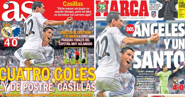 People might start thinking that Marca and As are the same newspaper with a different logo. For the millionth time, the two main Spanish newspapers have picked the same picture for their front page and also the same focus, as they overemphasize Iker Casillas’ role in the 4-0 victory over Copenhagen.