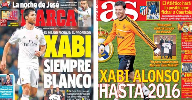 Madrid sports newspapers put their focus today on Xabi Alonso’s contract renewal with Real Madrid. “Xabi forever Blanco,” Marca titles.