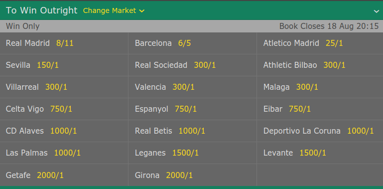 La Liga starts this Friday and we want to have a look at the bookmakers to see which team is the favourite to win the trophy. After winning the Spanish Supercup against FC Barcelona, Real Madrid are big favourites to win La Liga trophy again. For instance, we can back Los Blancos in bet365 with 8/11 odds.